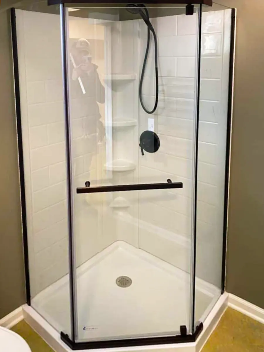 We completely reimagined this 6×10 bathroom in Omaha, turning a cramped, outdated space into a bright and functional retreat. A corner shower with a grid glass door instantly opened up the room, while a custom vanity was perfectly sized to make the most of the limited space.